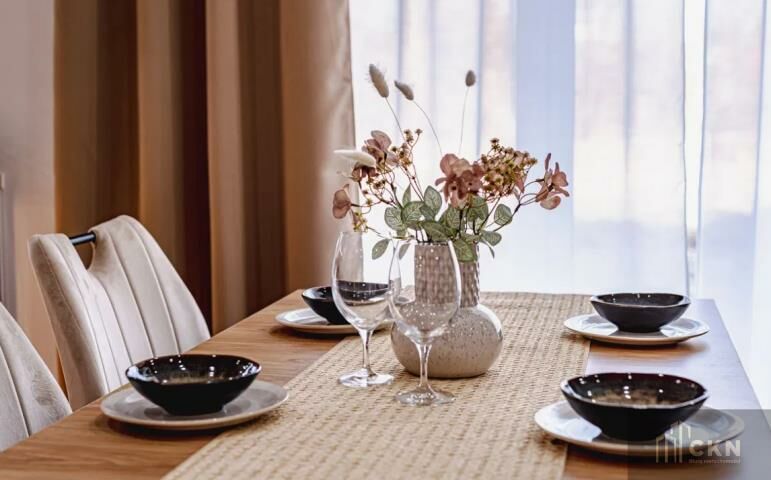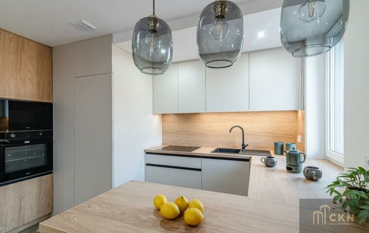 Apartament jest wyposażony: kuchnia z nowoczesnymi sprzętami AGD (zmywarka, lodówko-zamrażarka, płyta indukcyjna, piekarnik, mikrofalówka) i meblami na wymiar. Klimatyzacja w całym apartamencie, ogrzewanie podłogowe, energooszczędne oświetlenie, okna trzyszybowe.